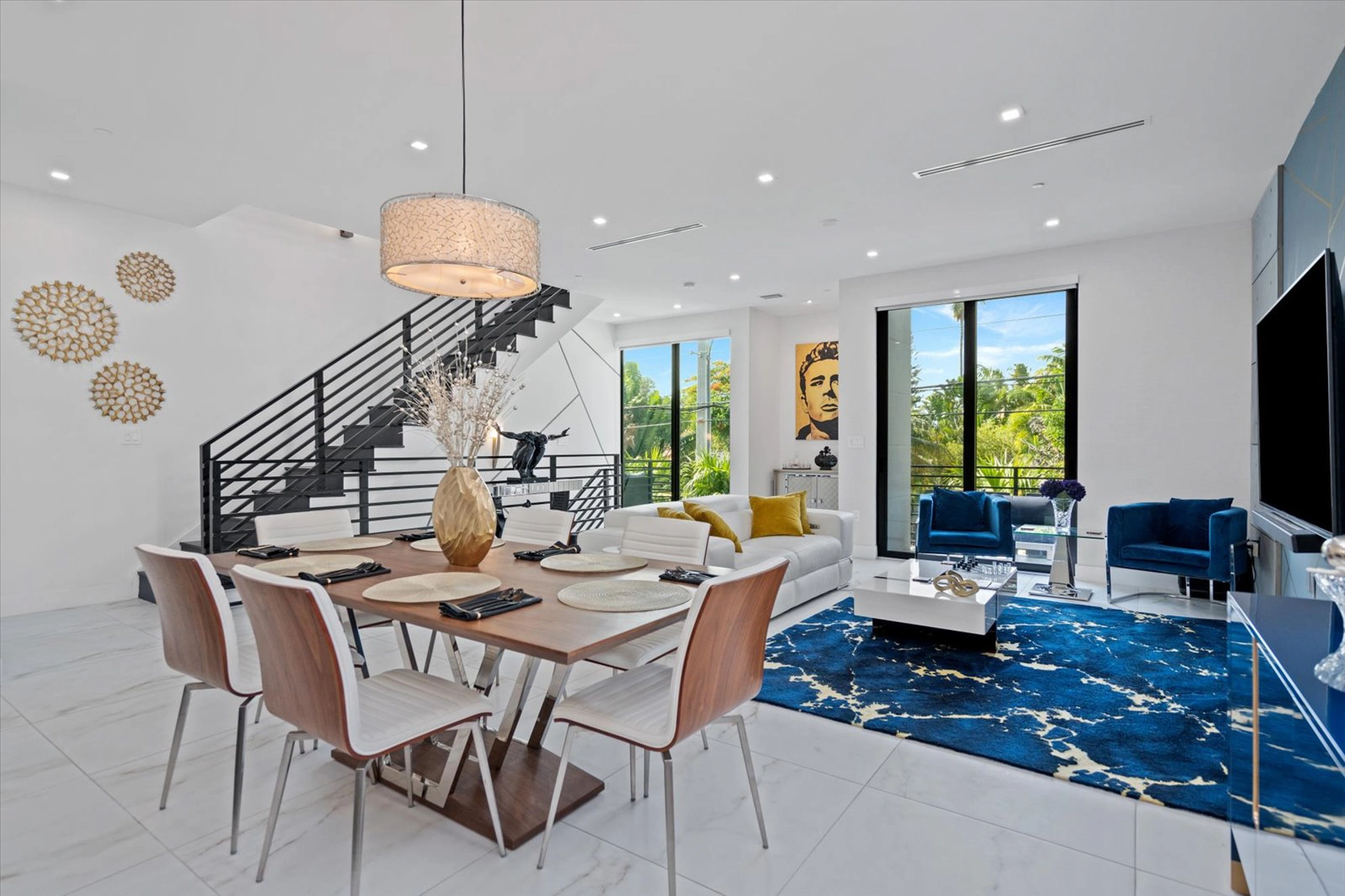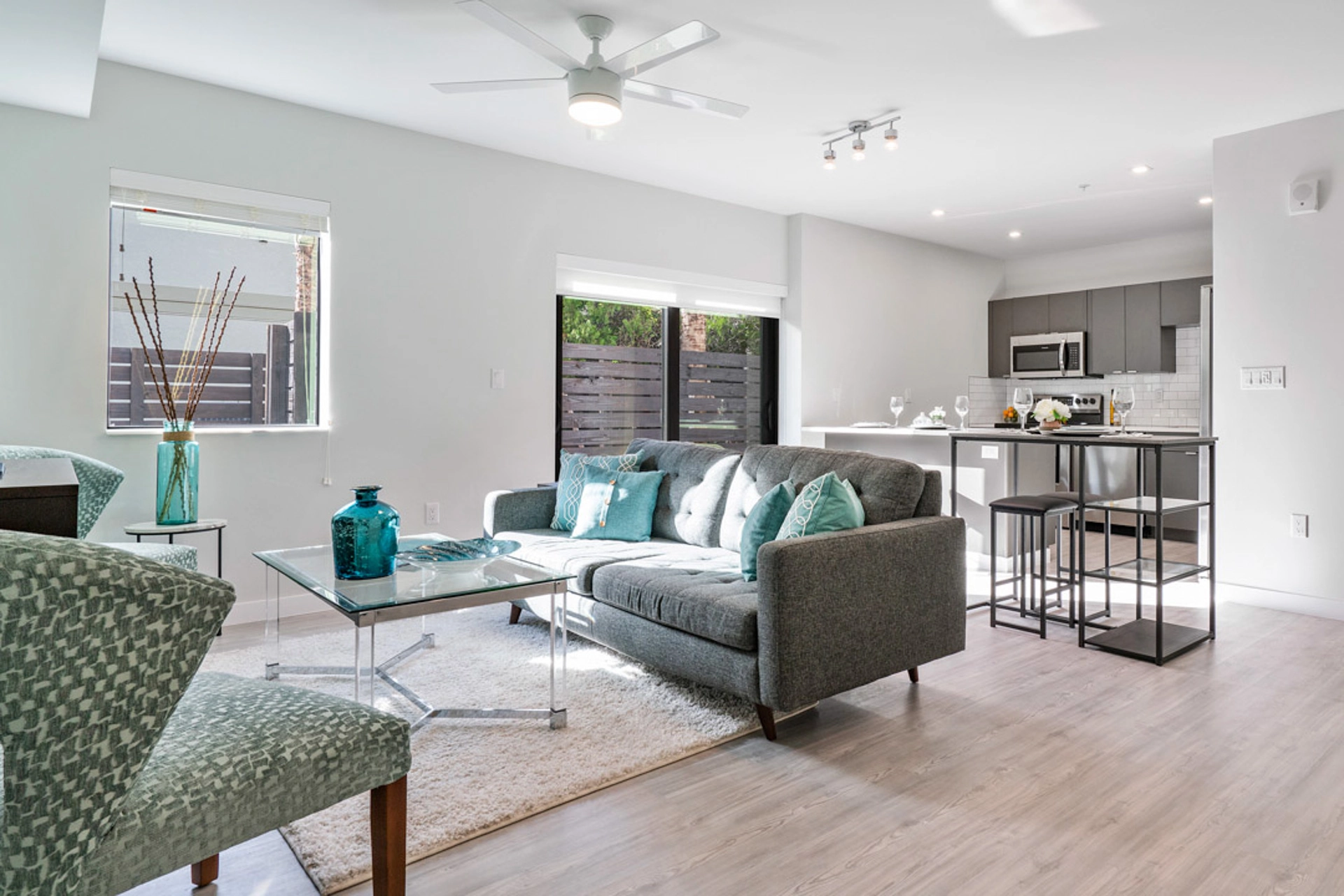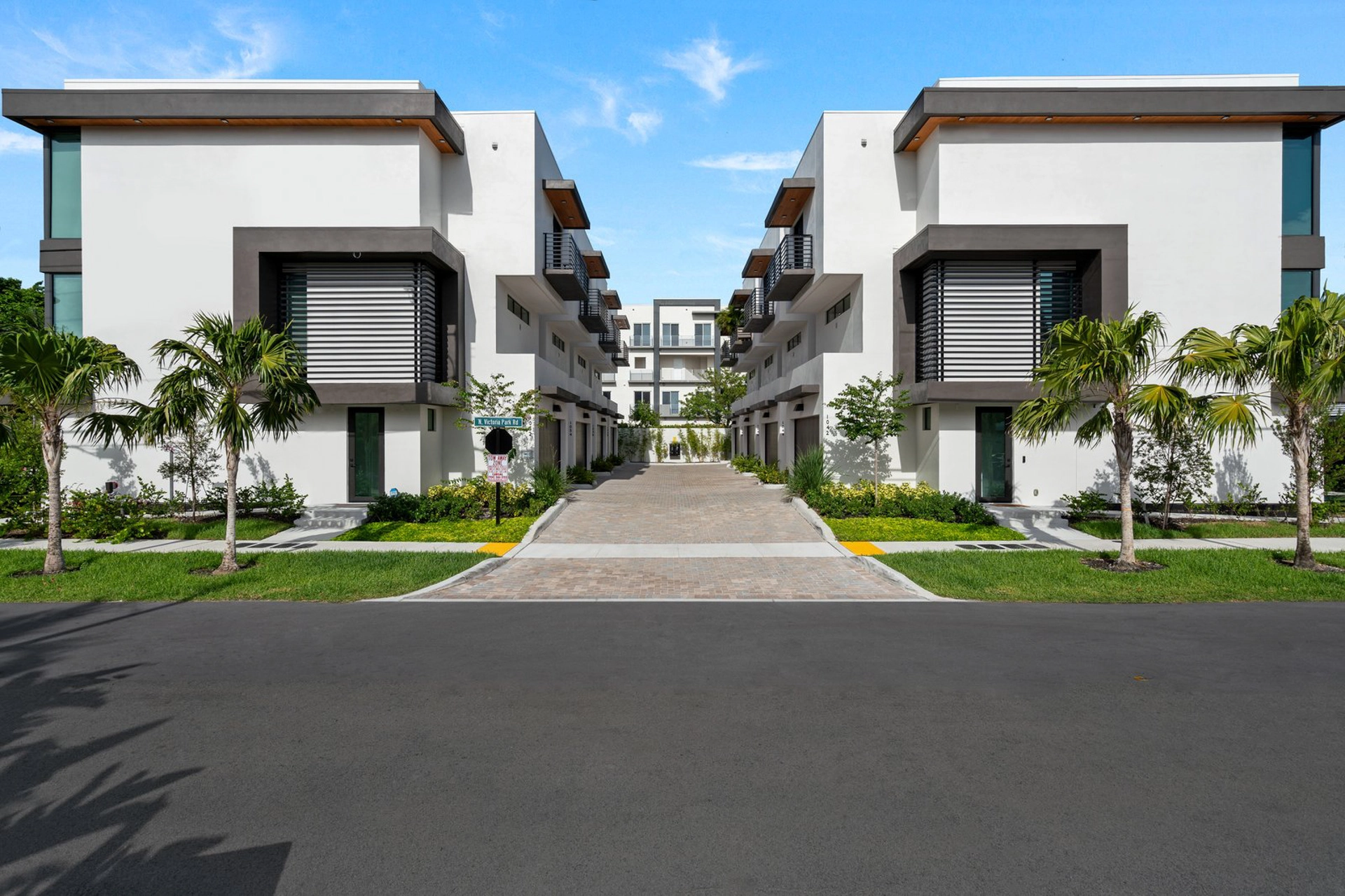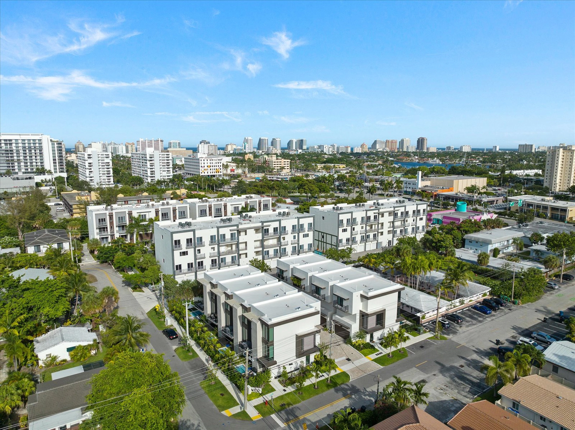 A contemporary 3-story garden-style apartment development located in Fort Lauderdale featuring rooftop balconies, direct access garages, and private pet yards.